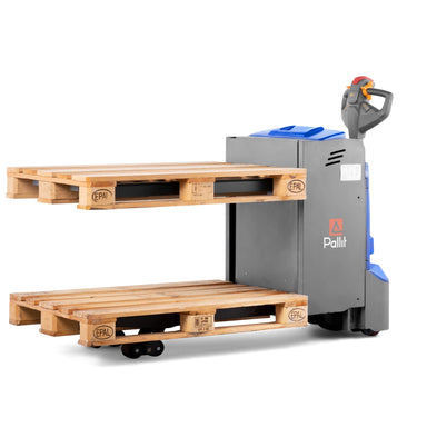 Our UP electric pallet truck with a lifting height of 800 mm is an ideal helper for order picking work. It offers space for 2 pallets and thus spe...